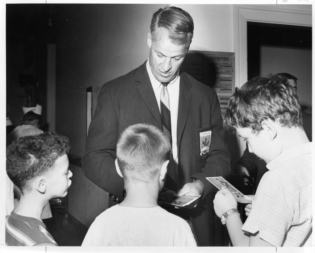 In 1964 the Boston Bruins trained in London, Ontario and visited the War Memorial Children’s Hospital. Team members including Captain Leo Boivin (defence), Tom Johnson (defence) and Orland Kurtenbach (centre) signed autographs.
