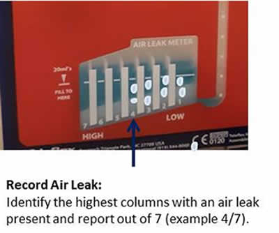 The underwater seal chamber is divided into 7 (or 5) vertical columns to provide a semi-quantitative assessment of the amount of leak. Identify the highest number where air bubbles are detected to determine the severity of the leak and document out of 7 (or 5). For example, a leak of 1/7 (bubbles only in the first column) is very small. A leak of 4-5/7 or higher is a significant leak.