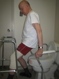Sliding your operated leg forward, place both hands on the arms of the raised toilet seat.